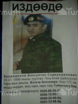 Чек араны кайтарууга чыккан боюнча куралы менен жоголгон уулу — «Карамык» тозотунун катардагы жоокери Б.Бааридиновду издөө иштерине ата-энеси нааразы